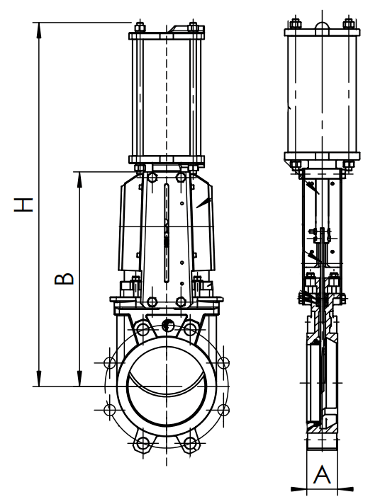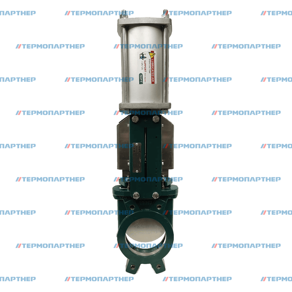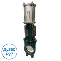Корпус VG4400 Dn350 выполнен из ковкого чугуна EN-GJS-500-7, нож (шибер) из нержавеющей стали AISI 304. Присоединение межфланцевое с диаметром Ду350 мм, максимальное рабочее давление 7 бар, управление происходит с помощью пневмопривода.